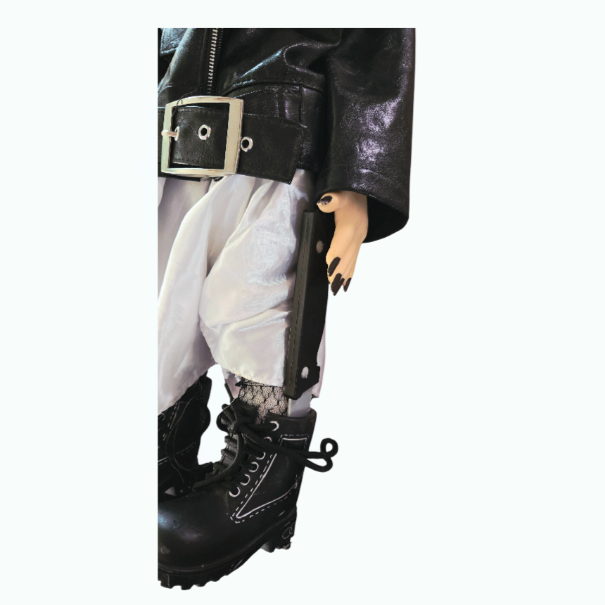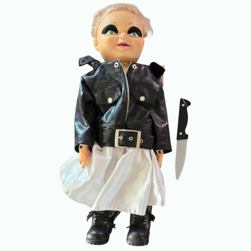 - Tiffany: Features bright green eyes, platinum blonde hair styled in a messy bun, and a "dreadful killer" expression. Wearing her signature outfit from the film, which includes a white wedding dress and a black faux-leather biker jacket.