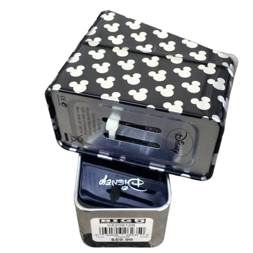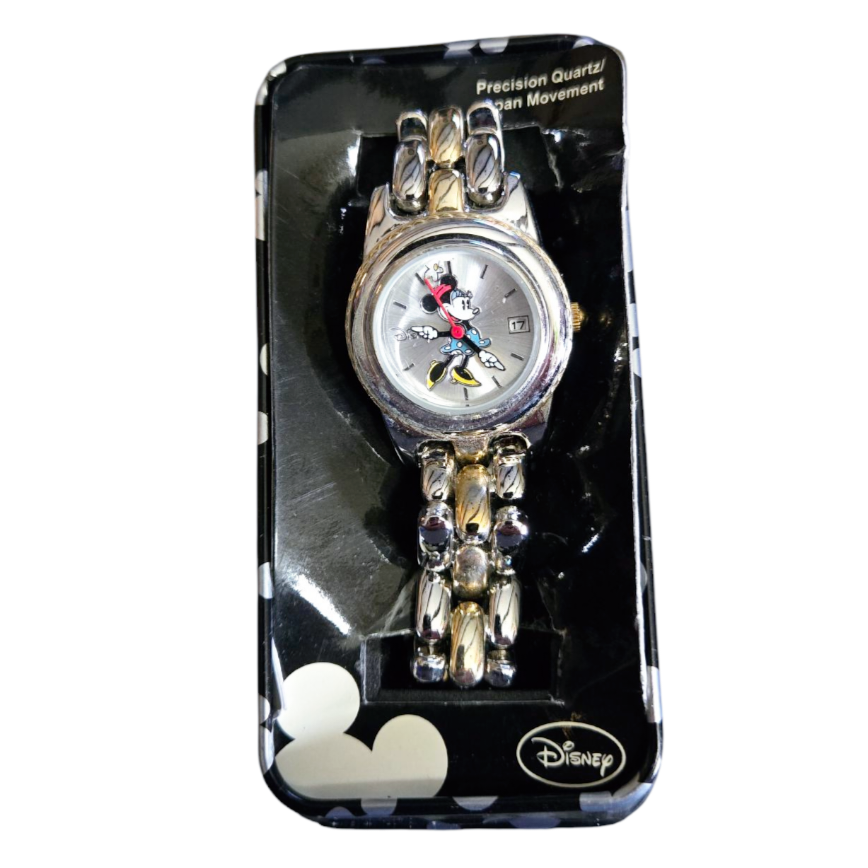 An adorable Minnie Mouse watch or a welcomed addition for a Disney collector. Officially licensed. Minnie’s arms rotate to tell the time. Includes date dial. Two tone metal band. Can be adjusted by removing links.