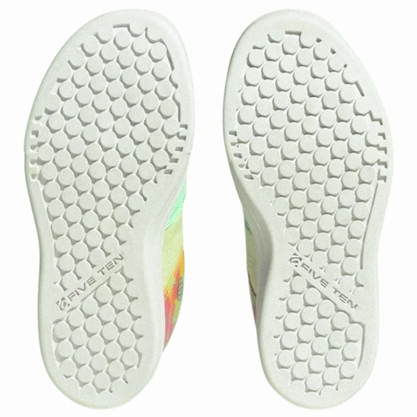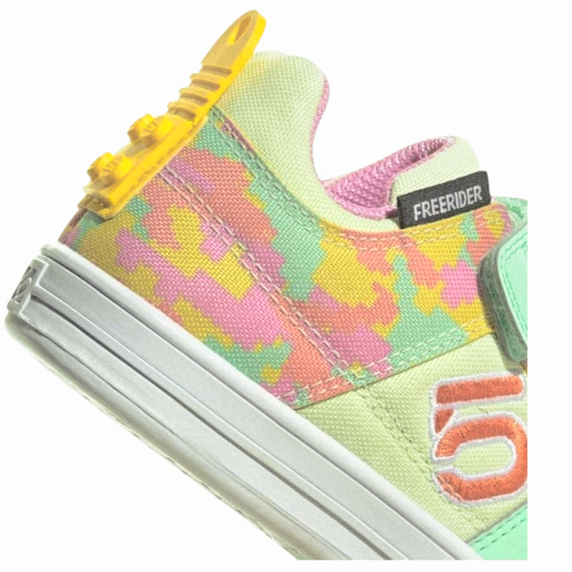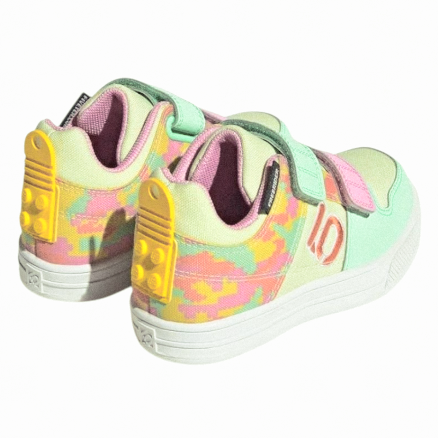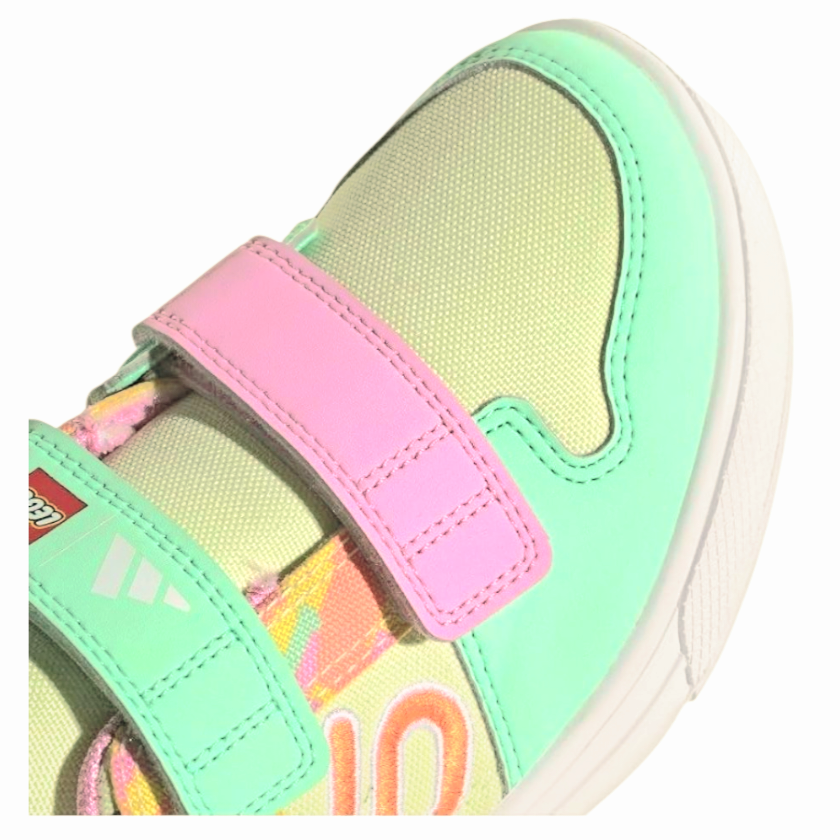 Get your little rider excited to pedal. These kids' Adidas Five Ten Mountain Bike Shoes bring LEGO to the bike with colorful LEGO-inspired graphics. The pedal-gripping power of Stealth Marathon rubber keep kids shredding. Hook-and-loop straps make for easy on and off for independent young riders, and the non-marking Marathon rubber makes them great for everyday wear too. Made with a series of recycled materials, this upper features at least 50% recycled content.