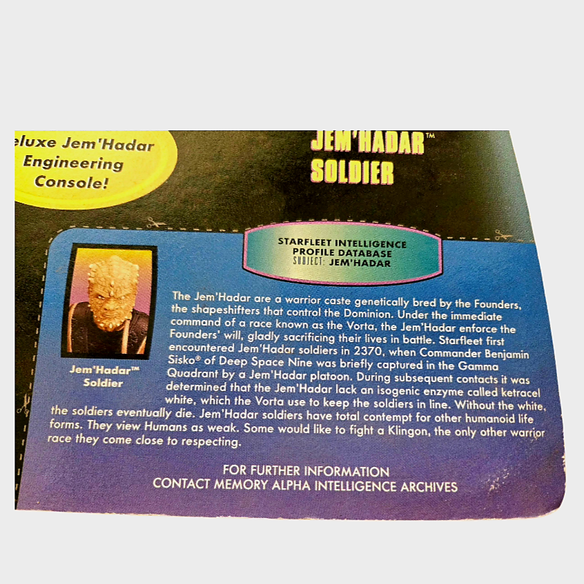 Included Accessories: This 6" figure comes with a "Deluxe Jem'Hadar Engineering Console," described as a "Diagnostic and Monitor Interface".