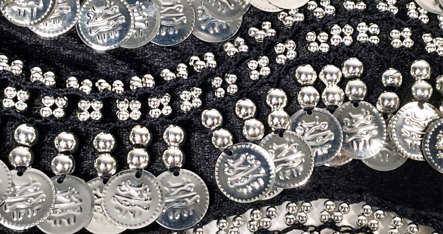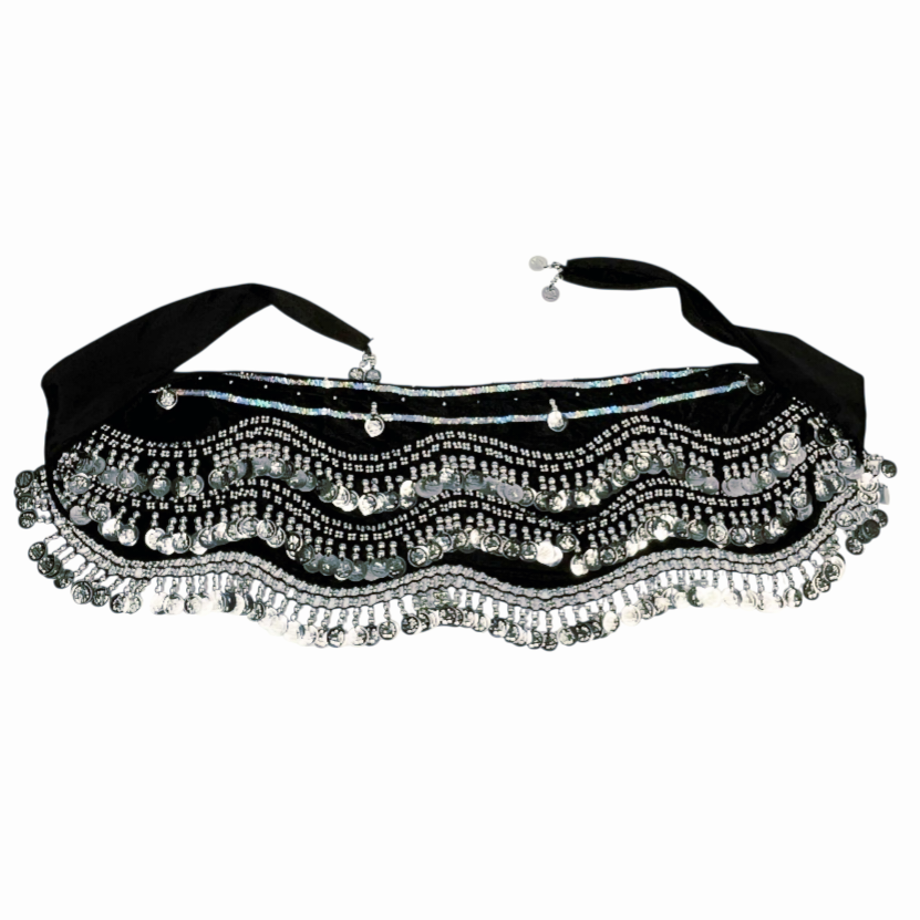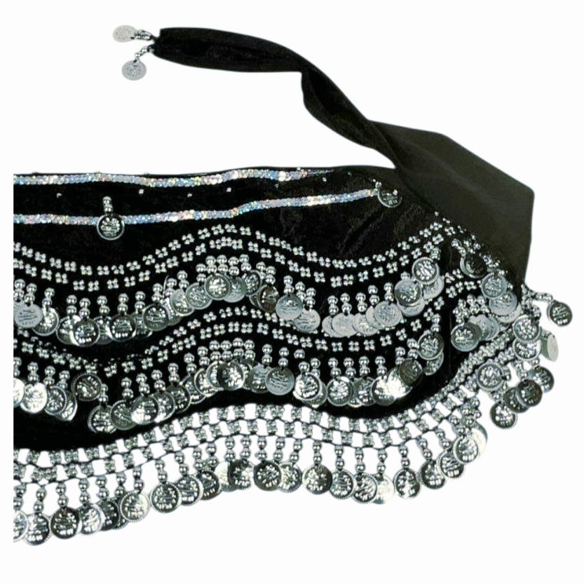 Women's Black Belly Dance Wave Shape Hip Scarf w/ Silver Coins (60")