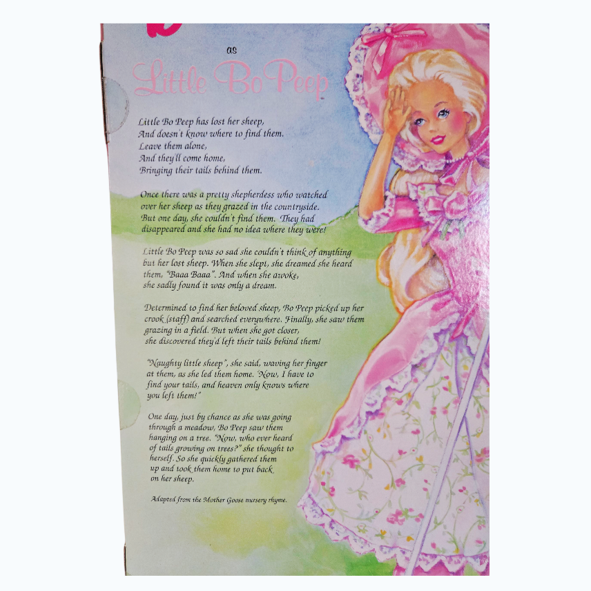 This Barbie doll depicts the nursery rhyme character Little Bo Peep. She wears a pink and white gown adorned with rosebuds and vines, trimmed with lace, and a large pink bonnet. She also carries a shepherd's staff.